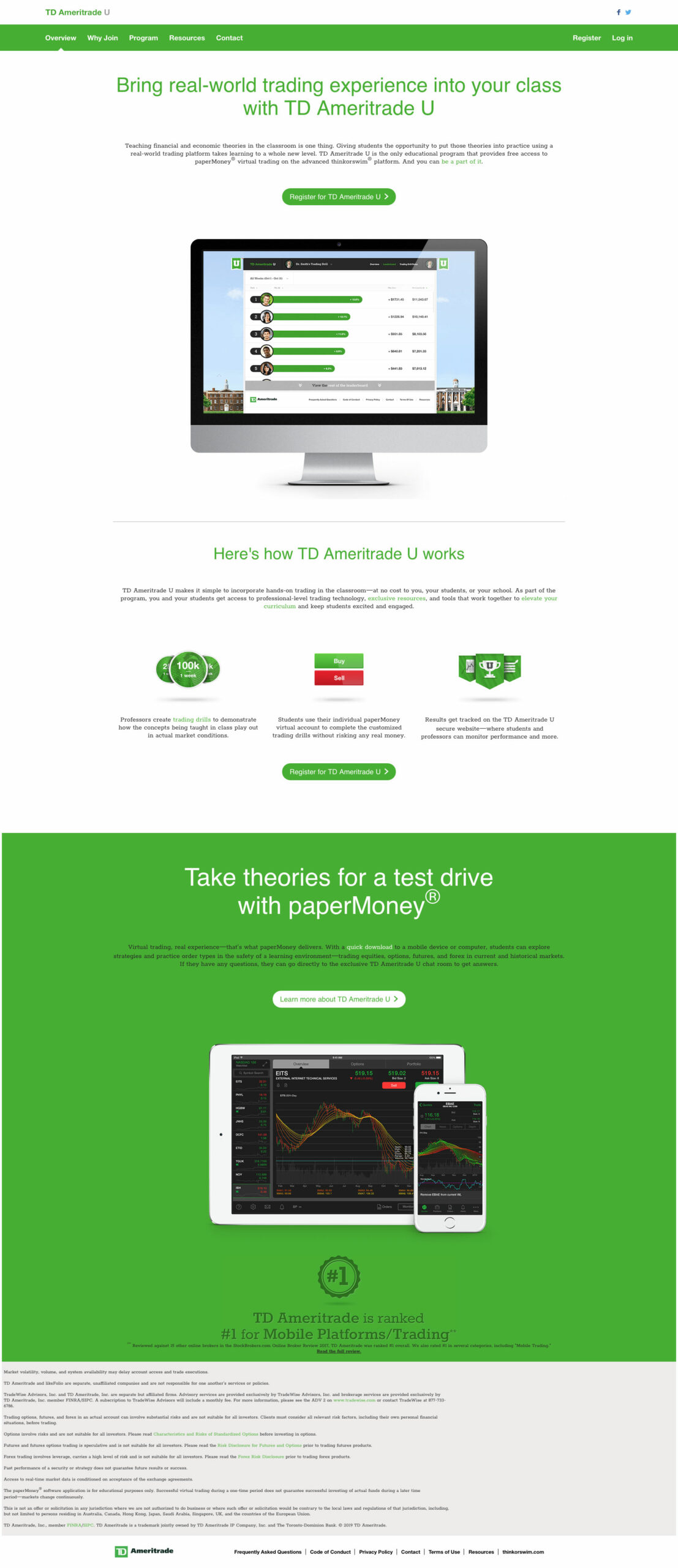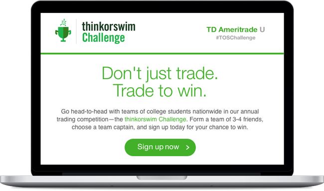 "Get 'em young, get 'em for life." That's the strategy behind the annual thinkorswim Challenge, a virtual trading competition for college students. They get to trade on paperMoney® in our thinkorswim® platform for a chance to win real prizes. We get to expose a potential client base to TD Ameritrade.